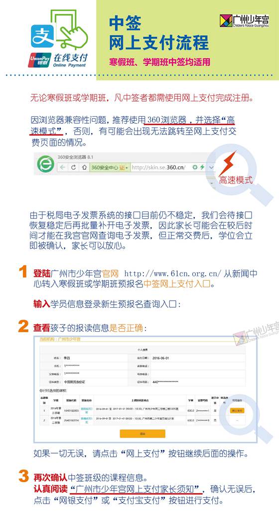 广州市少年宫2017年寒假短训班预报名抽签工作经已完成,本部课程的中签家长可以在24日下午16点前,通过下方“网上支付入口”进行学位注册。各社区少年宫课程的中签学员家长以及60岁以上不具备网上支付条件的本部中签学员家长及请于24日(周六)上午8:30~12:00,下午14:00~16:00亲临少年宫现场注册。