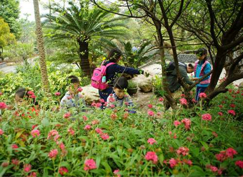 公园以人工湖为中心,环湖的一周,散落着4个小巧的主题式园林,这些园林都是在世界各地的园林博览会中获奖作品按一比一比例还原的。我们特别邀请了园林维护专家带领孩子们游览,并讲解岭南园林设计的特色和植物搭配。