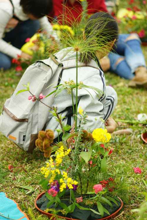 木本的枝条最长、插在最高处,有果实木本枝条略沉重,让它们在第二层,然后是一丛灌木花朵、还有草本的低矮花草。孩子们都知道“红花要有绿叶衬”,但是石块、枯枝和落叶也是作品的一部分,它们代表时间和生命的历程。