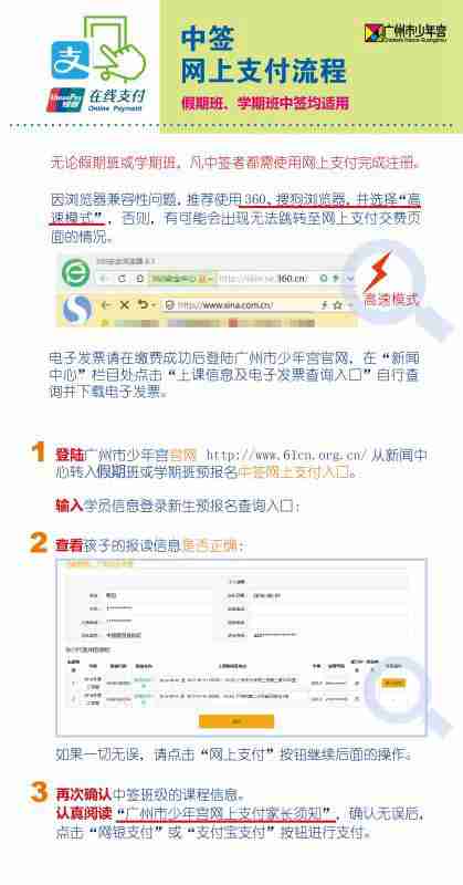 广州市少年宫2017年第二学期学期班预报名抽签工作已经完成,本宫课程的中签学员家长请在6月29日(周四)8:30-16:00或7月1日(周六)8:30-16:00,登陆广州市少年宫官网,在“新闻中心”栏目点击2017年第二学期学期班预报名中签网上支付入口进行支付(6月30日因月底财务结算原因,暂停支付一天)。各社区少年宫的中签学员家长或60岁以上不具备网上支付条件的中签学员家长,请于7月1日(周六)上午8:30-12:00,下午14:00-16:00前往中签课程所在社区少年宫或少年宫本宫现场缴费注册。