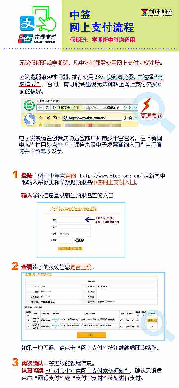 3.网上支付成功后一定要等待页面跳转回少年宫的注册页面,把开课日期、上课时间、地点等信息记录或打印出来,以免错过上课时间;