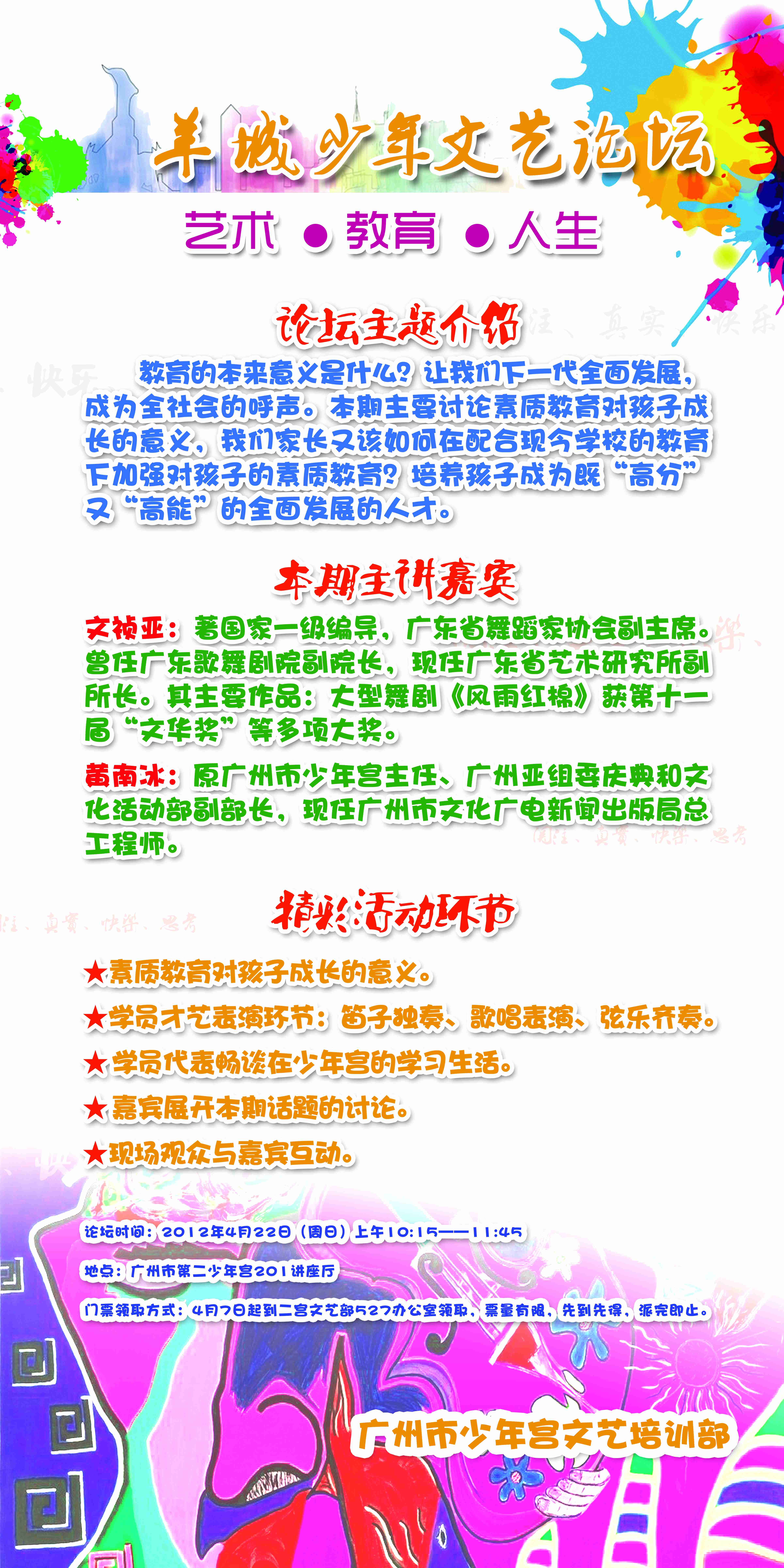 (周日)在广州市第二少年宫201讲座厅继续举行。本次我们特邀了著名编导文祯亚老师及市文化局总工程师黄南冰先生两位嘉宾前来参与论坛,与观众一起探讨素质教育对孩子成长的意义。有兴趣参加的家长可于本周六日到二宫