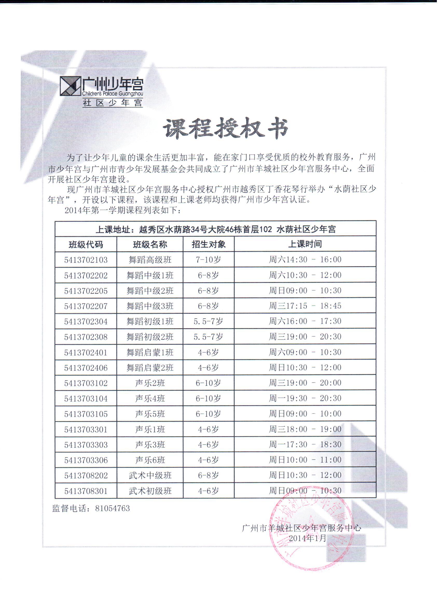2014年沙河街社区少年宫课程授权书